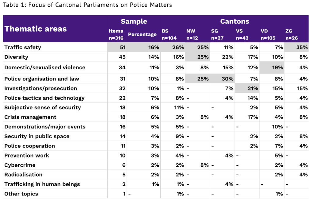 In Switzerland, the police sector is primarily a cantonal policy area – which means it is widely distributed across an uneven field of subnational entities. Also because of this, political debates surrounding policing in Switzerland are largely under-researched today. A systematic inter-cantonal understanding of how the police is a subject of political debate, for example, is still lacking. In a new snapshot analysis focusing on six cantons and one legislative year, Anna Grüninger and I shed light on how members of the cantonal parliaments engage with policing matters. The findings point to varying degrees of parliamentary activity, and a wide thematic range in their dealings with police issues — coupled with a notable reluctance to employ the most powerful parliamentary tools.