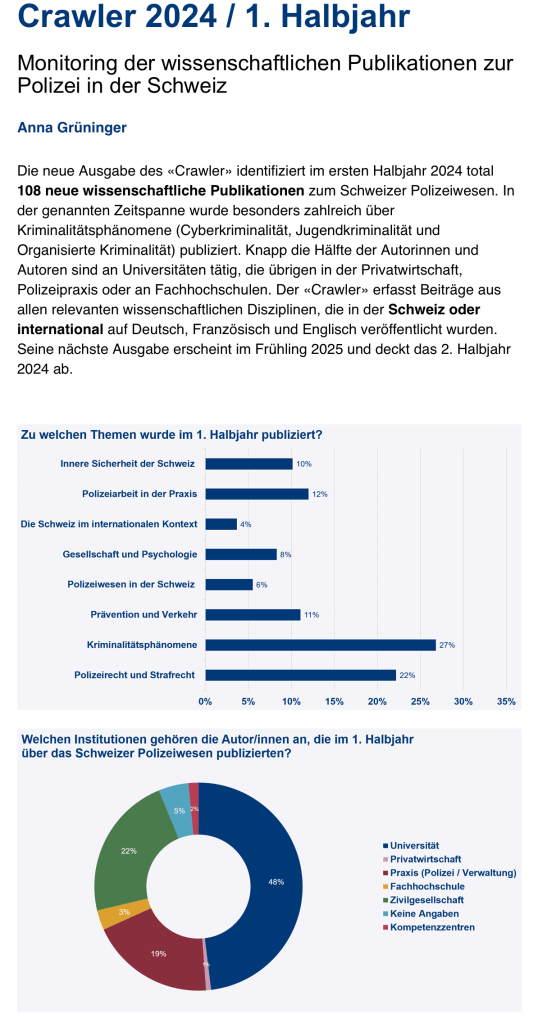 Wolf, Anna (2023). Crawler 2022 Monitoring der wissenschaftlichen Publikationen zur Polizei in der Schweiz. Basel: Kantonspolizei Basel-Stadt, 29p. PDF