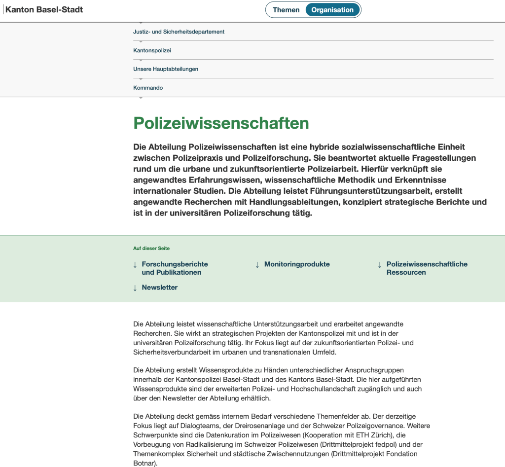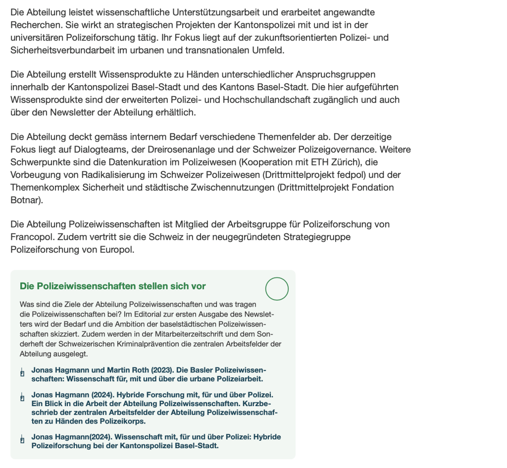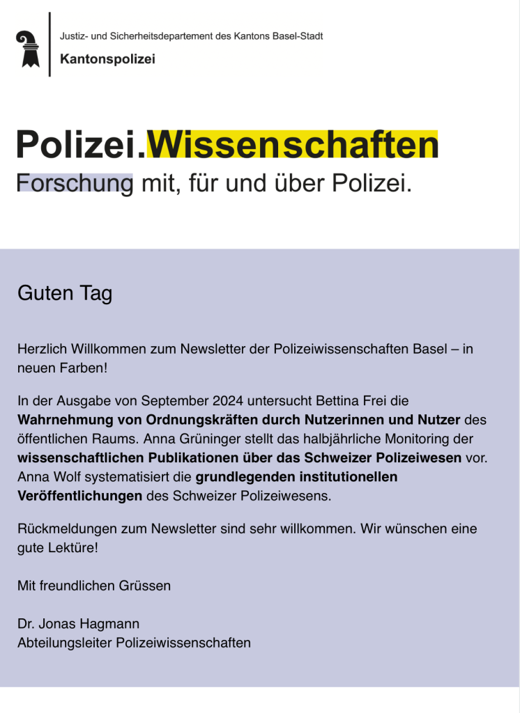 Hagmann, Jonas; Roth, Martin (2023). Die Basler Polizeiwissenschaften: Wissenschaft für, mit und über die urbane Polizeiarbeit. Basel: Kantonspolizei Basel-Stadt, 2p. PDF
