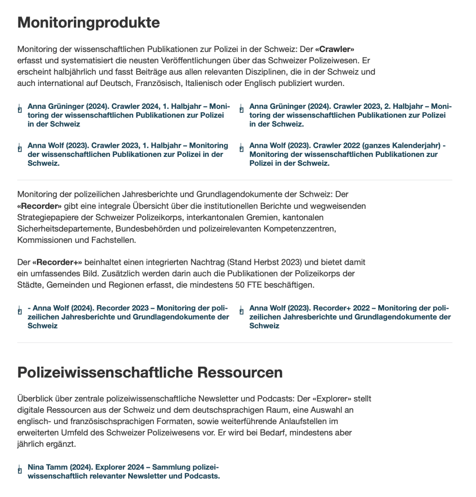Hagmann, Jonas; Wolf, Anna (2023/2024). Wie sich Polizei und Wissenschaft nun auch in der Schweiz besser entdecken / La police prend enfin sa place dans la recherche scientifique en Suisse / How the police and academia are discovering each other in Switzerland. DeFacto. 29 November 2023/10 January 2024. PDF DE / PDF FR / PDF EN